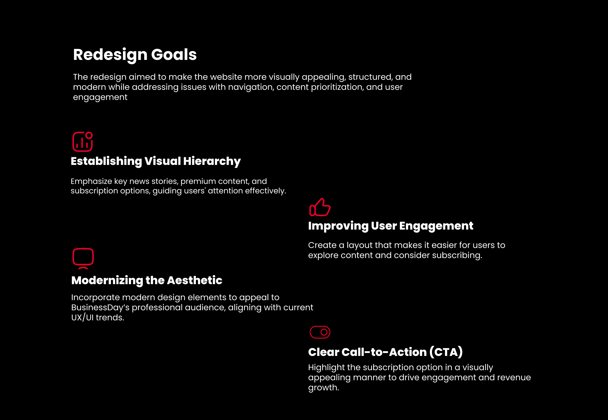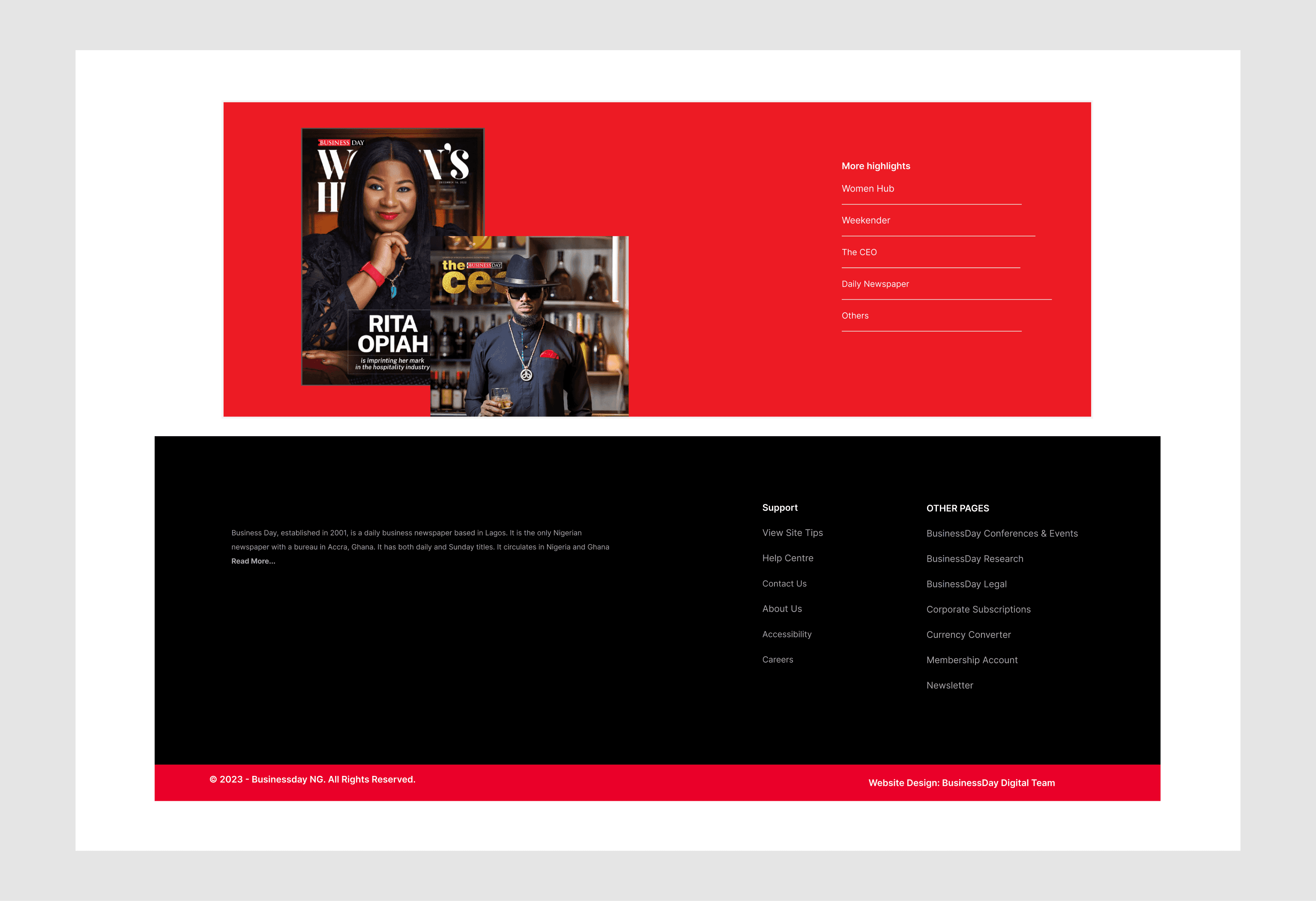 The redesigned BusinessDay website embraces a clean, modern, and editorial-forward design that reflects the brand’s authority in business journalism. The layout is structured around clarity and content hierarchy balancing strong headlines, intuitive navigation, and generous white space to improve readability. A modular card-based system allows for flexible content presentation across desktop and mobile, while the muted color palette with accents of BusinessDay’s signature red reinforces brand recognition. Every component, from article pages to the subscription flow, is optimized for user engagement, accessibility, and editorial ease creating a seamless experience that aligns with the needs of a digital-first audience.