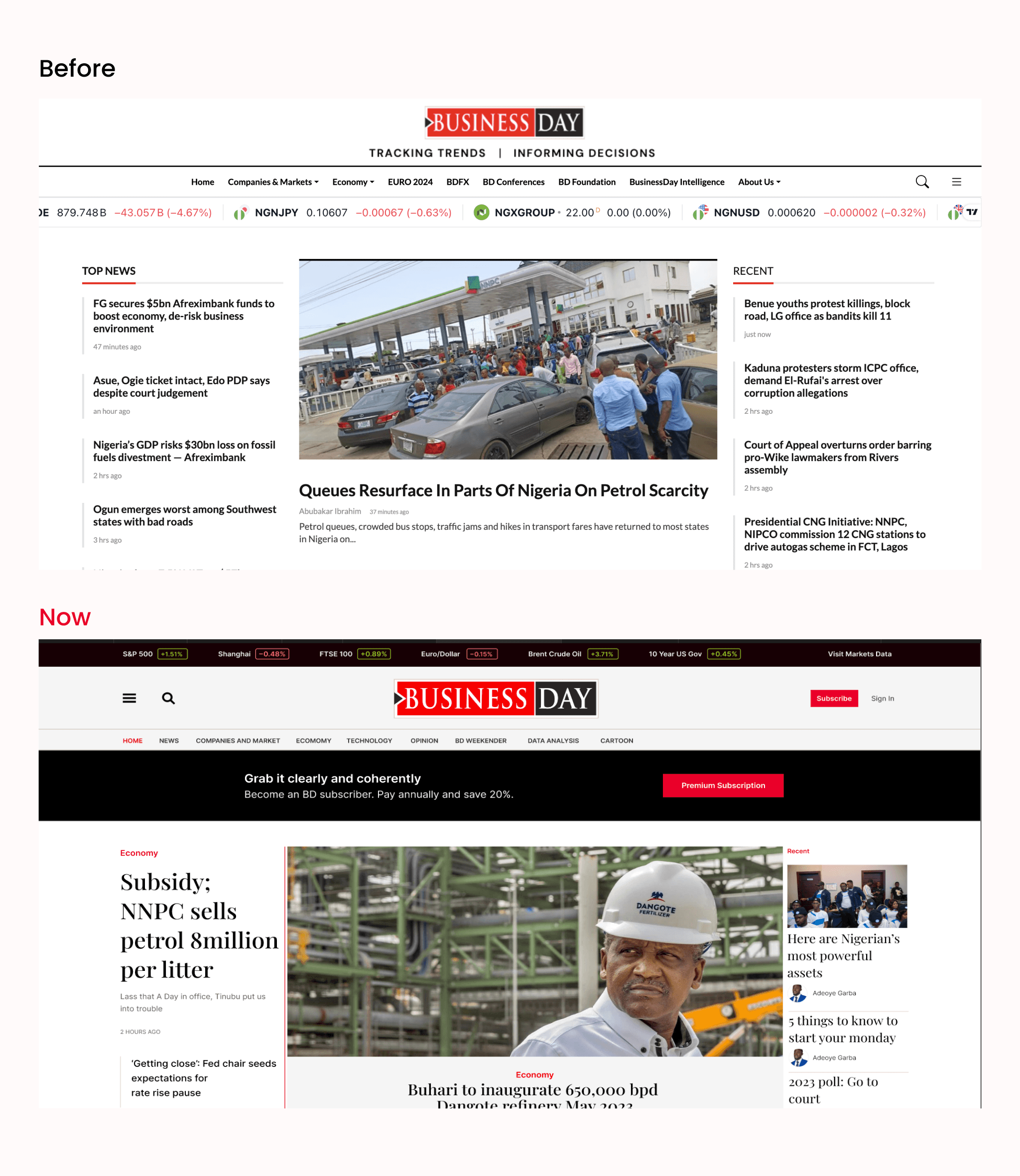 For decades, BusinessDay has stood as the voice of business and financial journalism in Nigeria. With a reputation built on truth, credibility, and editorial depth, it led conversations from boardrooms to classrooms. But while its content soared, its digital presence lagged behind. The website, a once groundbreaking portal was now clunky, inconsistent, and outdated. Pages took long to load. Readers struggled to find premium stories. The mobile experience? Barely functional.