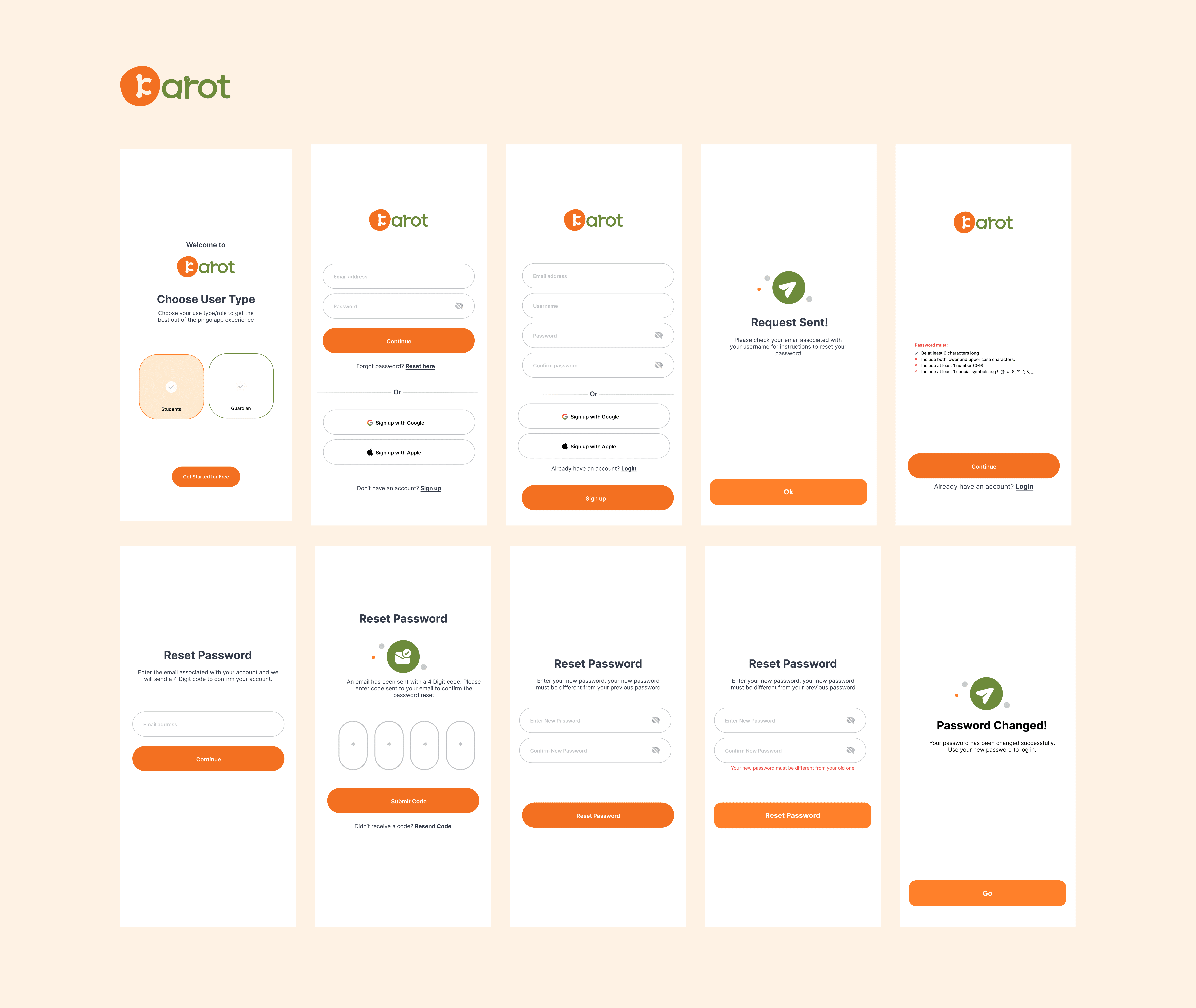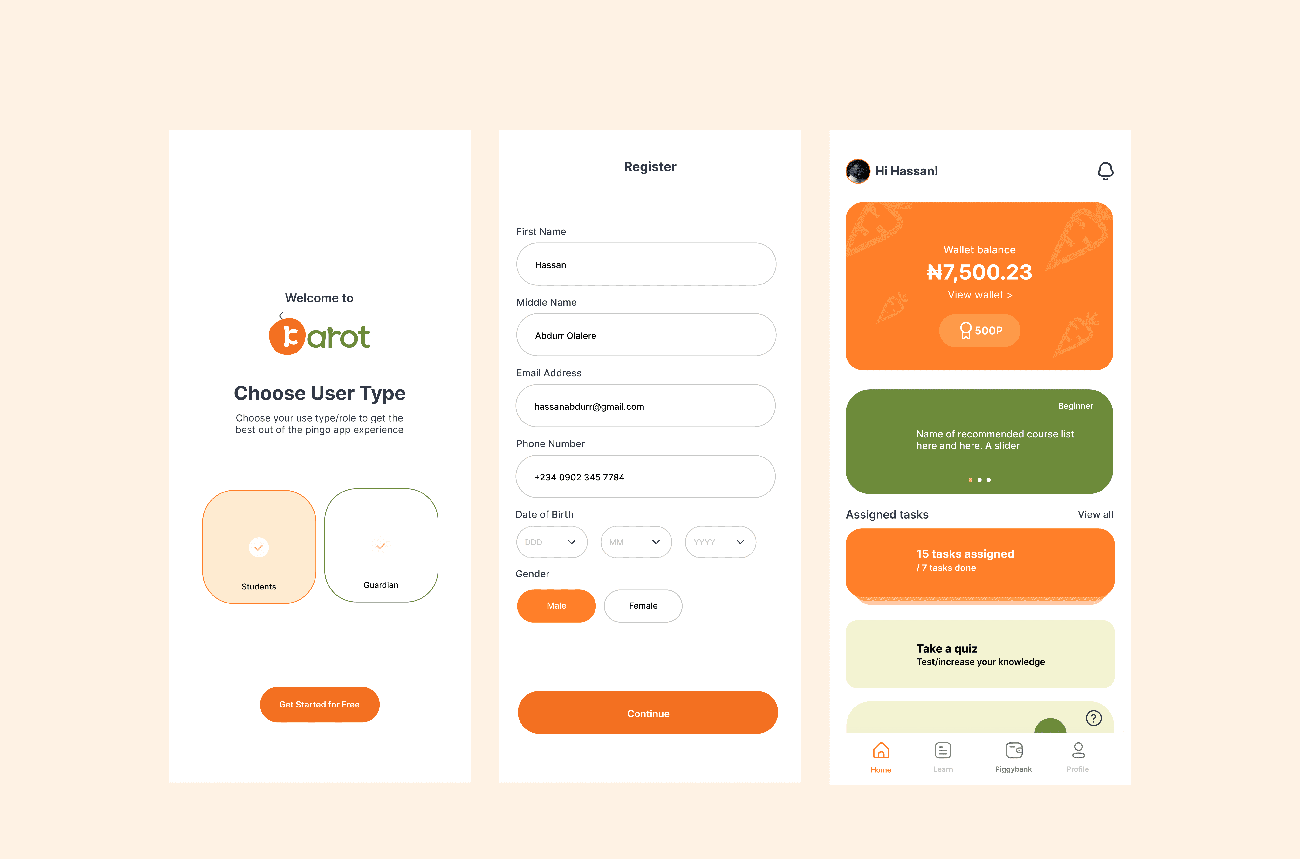 The onboarding flow for Karot was designed to be intuitive, friendly, and inclusive, catering to both students and guardians right from the first tap. With a clean layout, soft colour transitions, and clear hierarchy, each screen guides users through account creation, sign-in, and password recovery with minimal friction. I emphasized accessibility and trust through simple language, playful icon cues, and consistent use of brand colours making the onboarding feel less like a chore and more like an invitation to a meaningful journey in financial literacy.