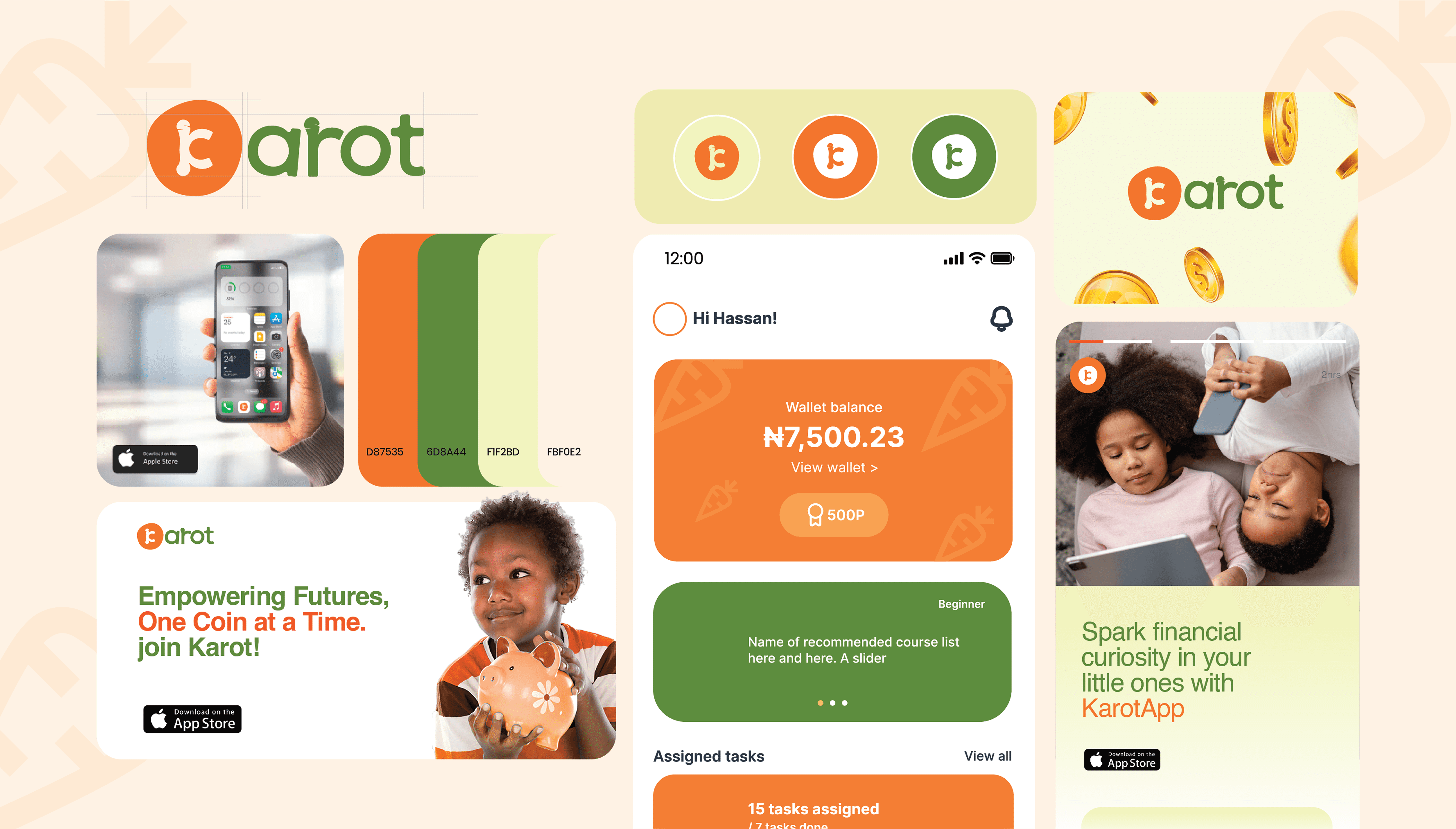 The logo features a stylized "K" formed into a carrot shape, while the supporting color palette, anchored in vibrant orange and leafy green,balances energy with trust. Soft, rounded typography and minimal, approachable iconography keep the tone inviting. Overall, the creative direction combines structure and spontaneity, speaking to both kids’ curiosity and parents’ need for assurance, making Karot a brand that grows with its users, one coin at a time.